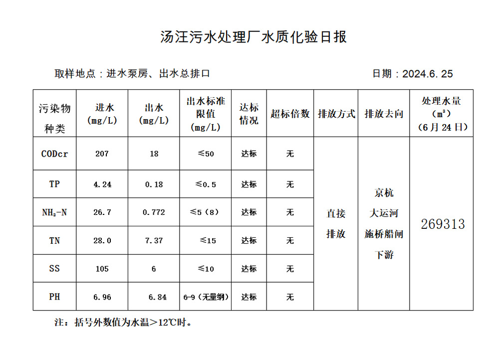 汤汪污水处理厂水质化验日报(2024.6.25)