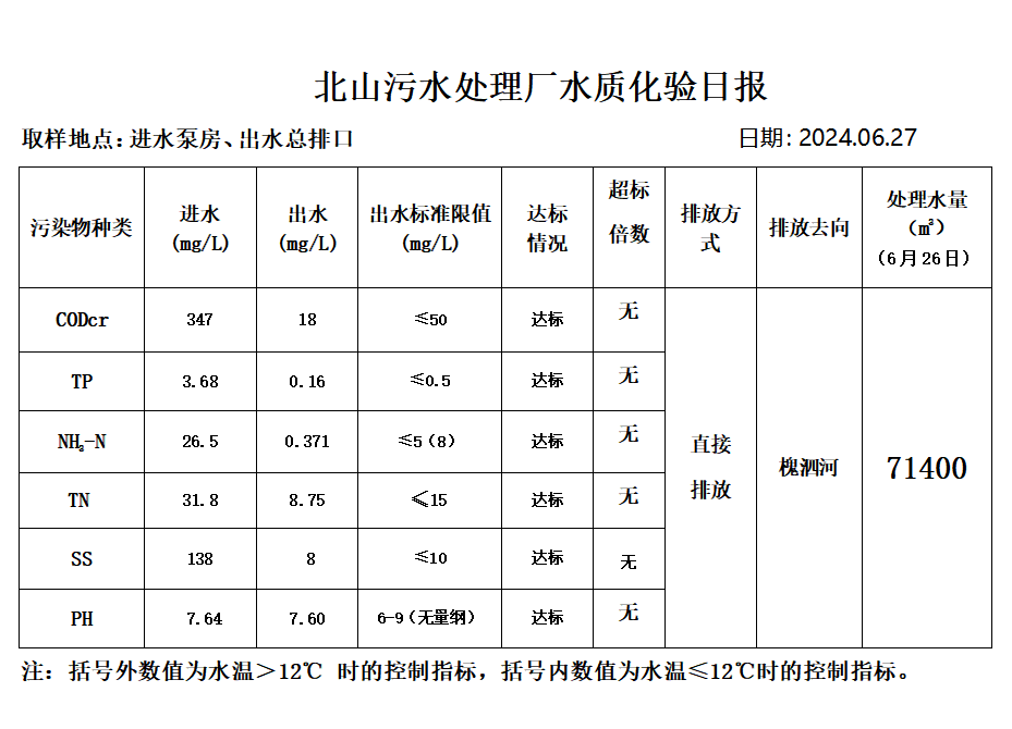 北山污水处理厂水质化验日报(2024.6.27)