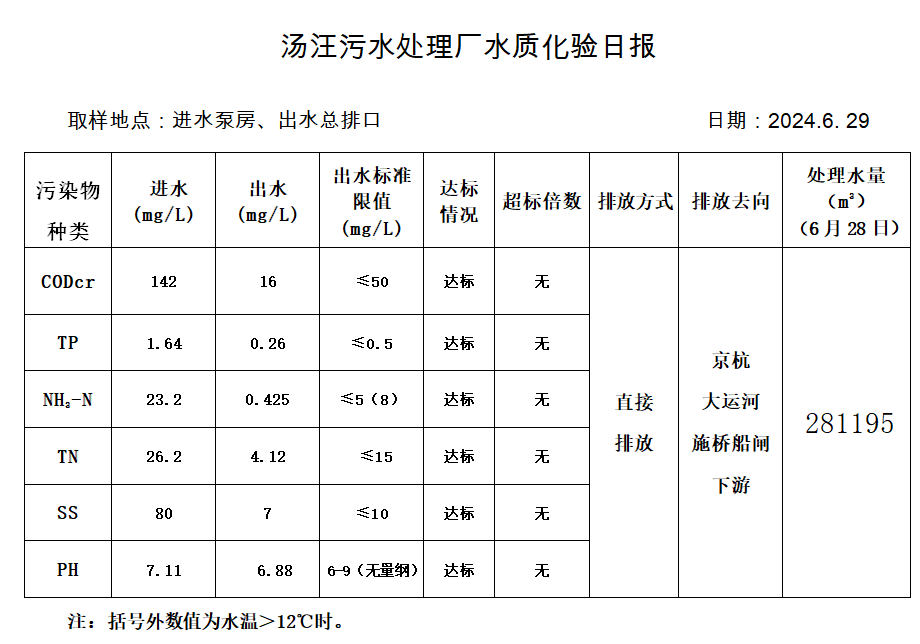 汤汪污水处理厂水质化验日报(2024.6.29)