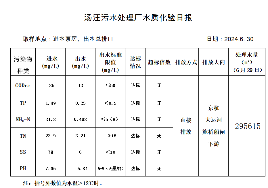 汤汪污水处理厂水质化验日报(2024.6.30)