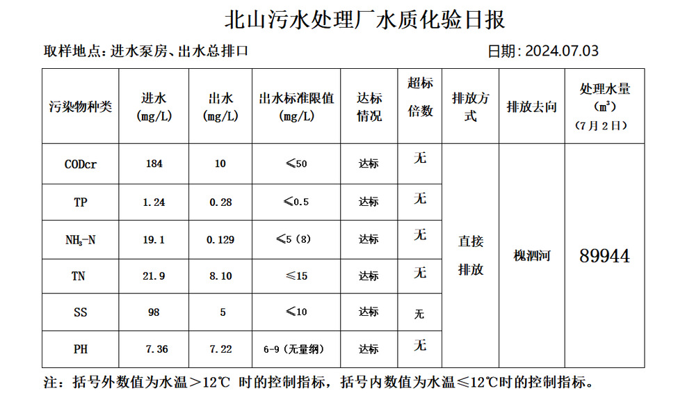 北山污水处理厂水质化验日报(2024.7.3)