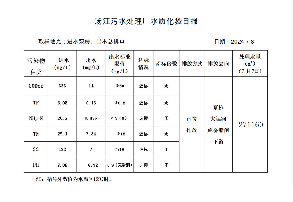 汤汪污水处理厂水质化验日报(2024.7.8)