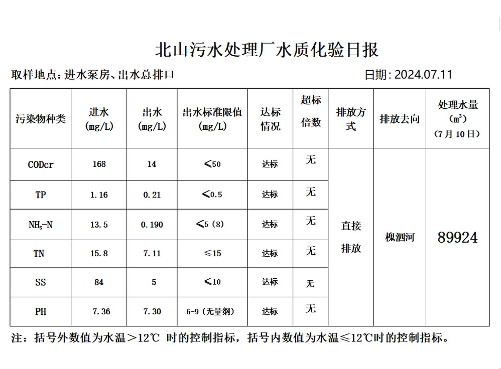 北山污水处理厂水质化验日报(2024.7.11)