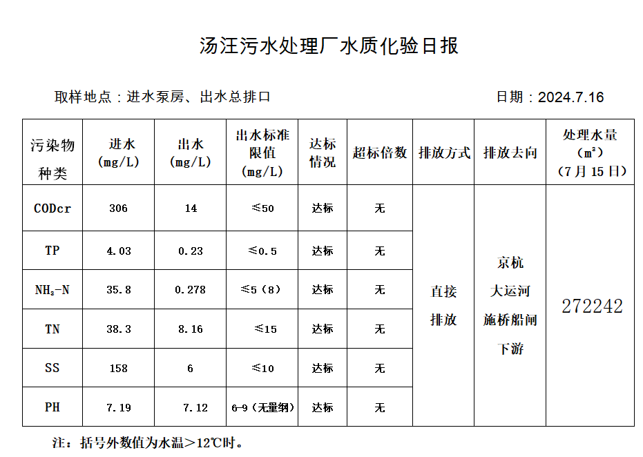 汤汪污水处理厂水质化验日报(2024.7.16)