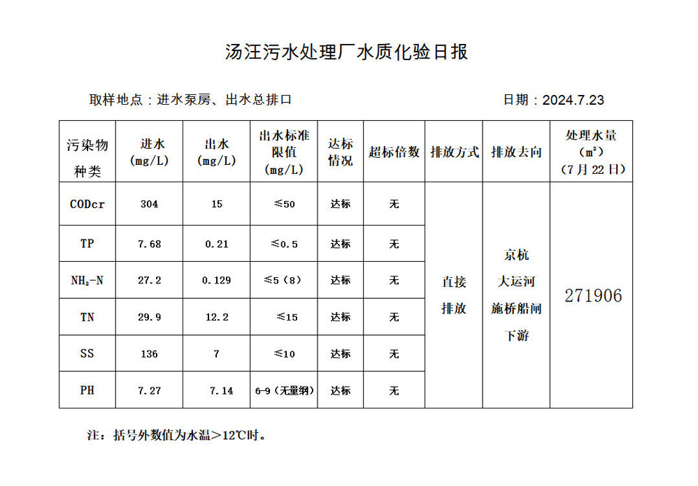 汤汪污水处理厂水质化验日报(2024.7.23)
