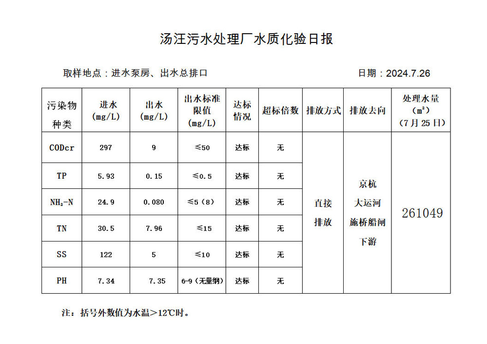 汤汪污水处理厂水质化验日报(2024.7.26)