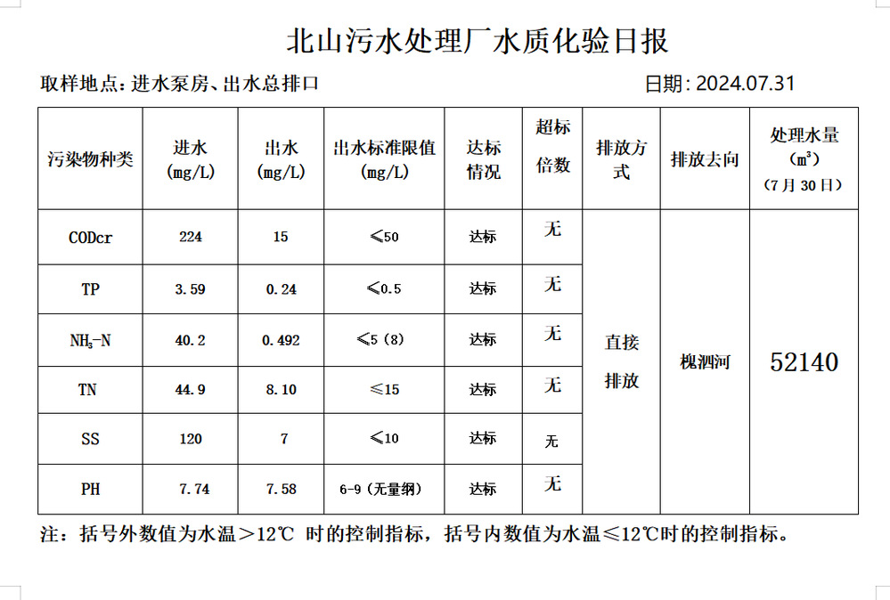 北山污水处理厂水质化验日报(2024.7.31)