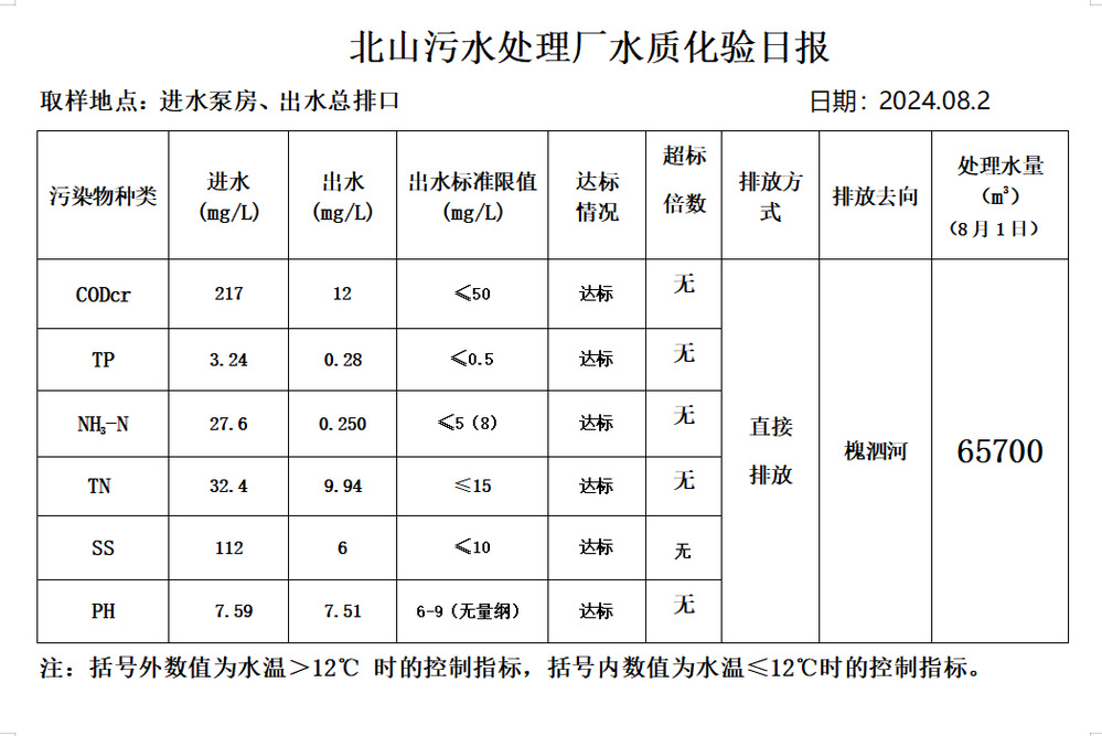 北山污水处理厂水质化验日报(2024.8.2)
