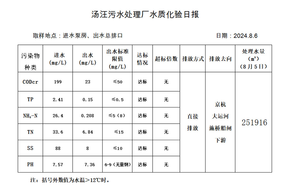 汤汪污水处理厂水质化验日报(2024.8.6)