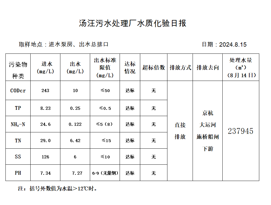 汤汪污水处理厂水质化验日报(2024.8.15)