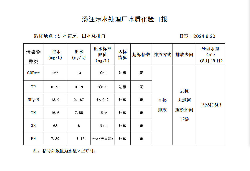 汤汪污水处理厂水质化验日报(2024.8.20)