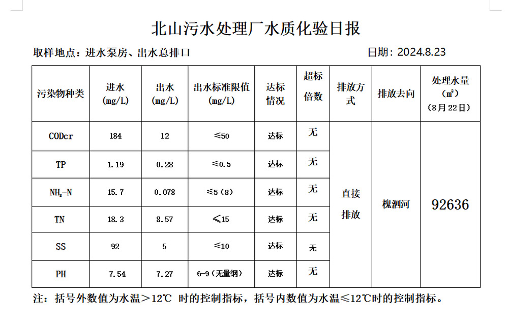 北山污水处理厂水质化验日报(2024.8.23)