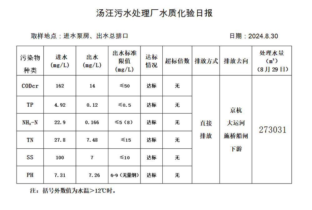 汤汪污水处理厂水质化验日报(2024.8.30)