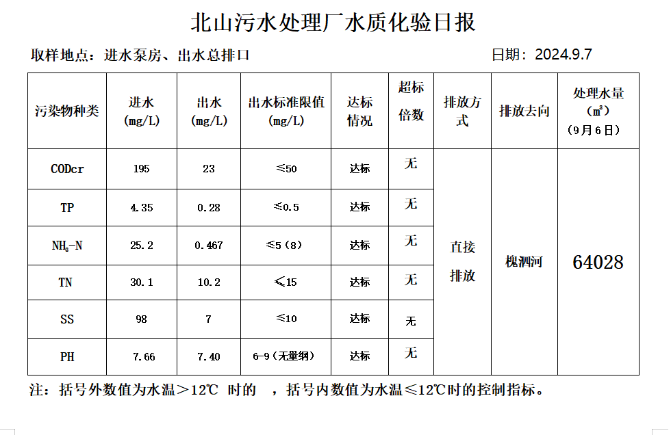北山污水处理厂水质化验日报(2024.9.7)