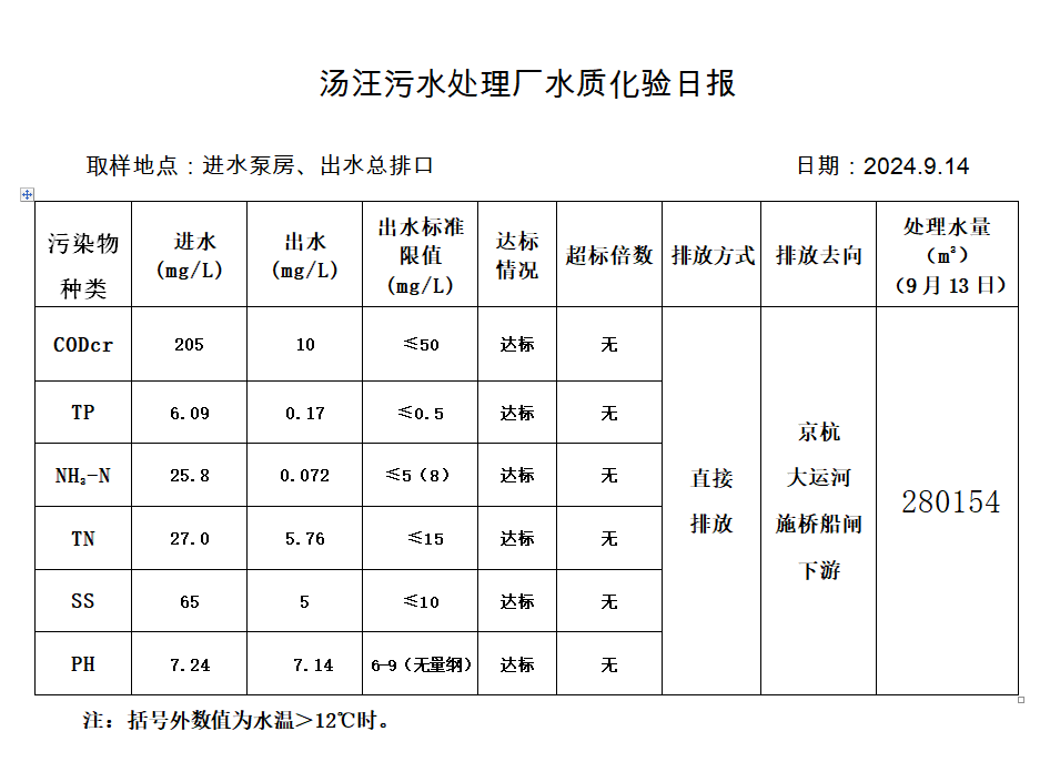 汤汪污水处理厂水质化验日报(2024.9.14)
