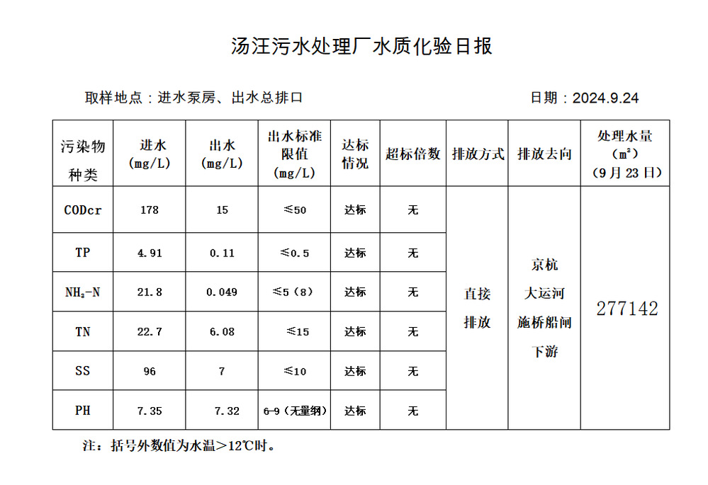 汤汪污水处理厂水质化验日报(2024.9.24)