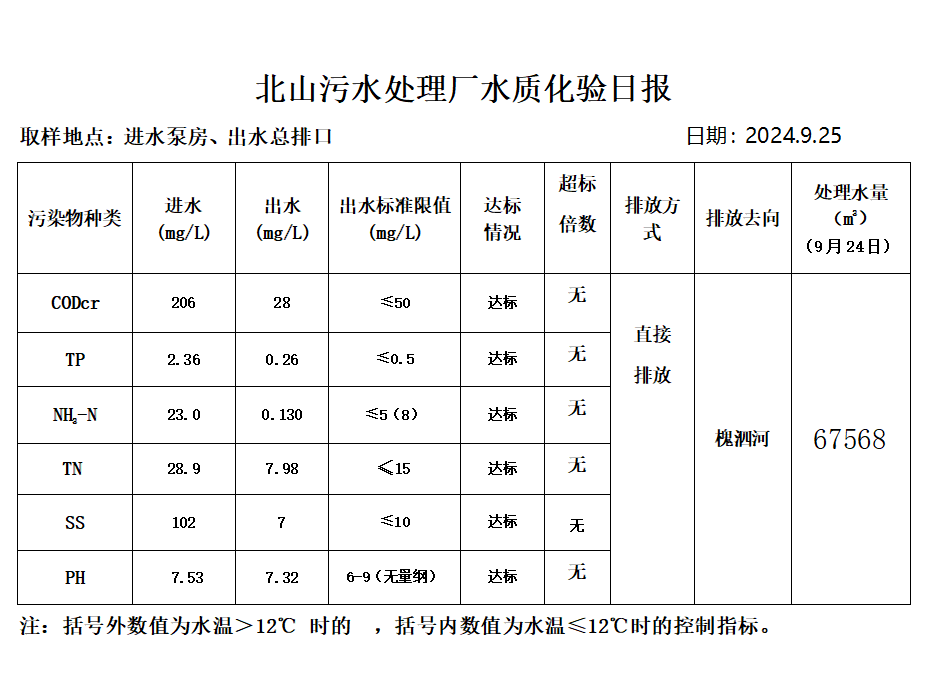 北山污水处理厂水质化验日报(2024.9.25)