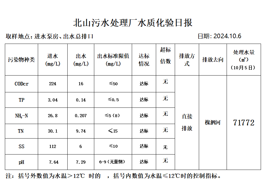 北山污水处理厂水质化验日报(2024.10.6)