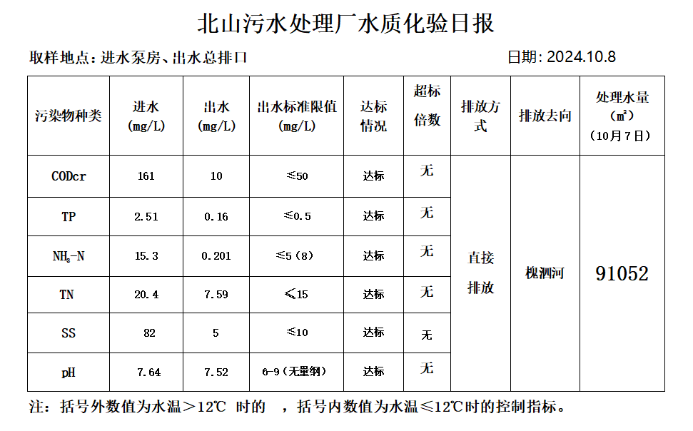 北山污水处理厂水质化验日报(2024.10.8)