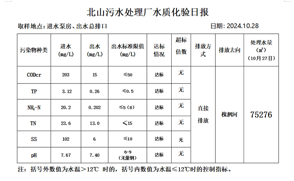 北山污水处理厂水质化验日报(2024.10.28)