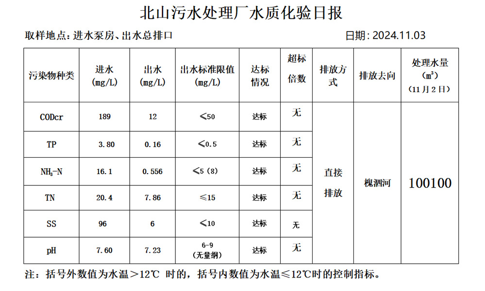 北山污水处理厂水质化验日报(2024.11.3)