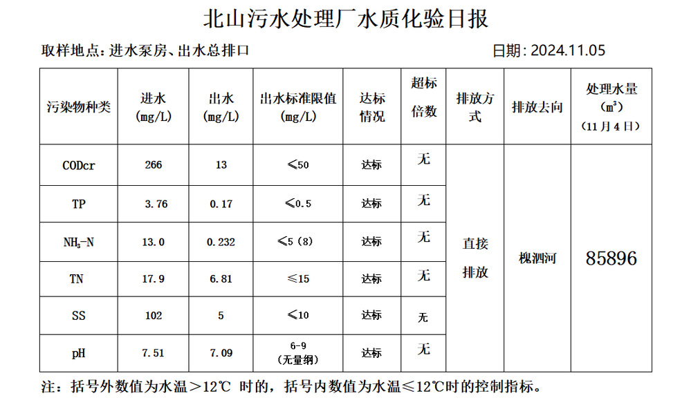 北山污水处理厂水质化验日报(2024.11.5)