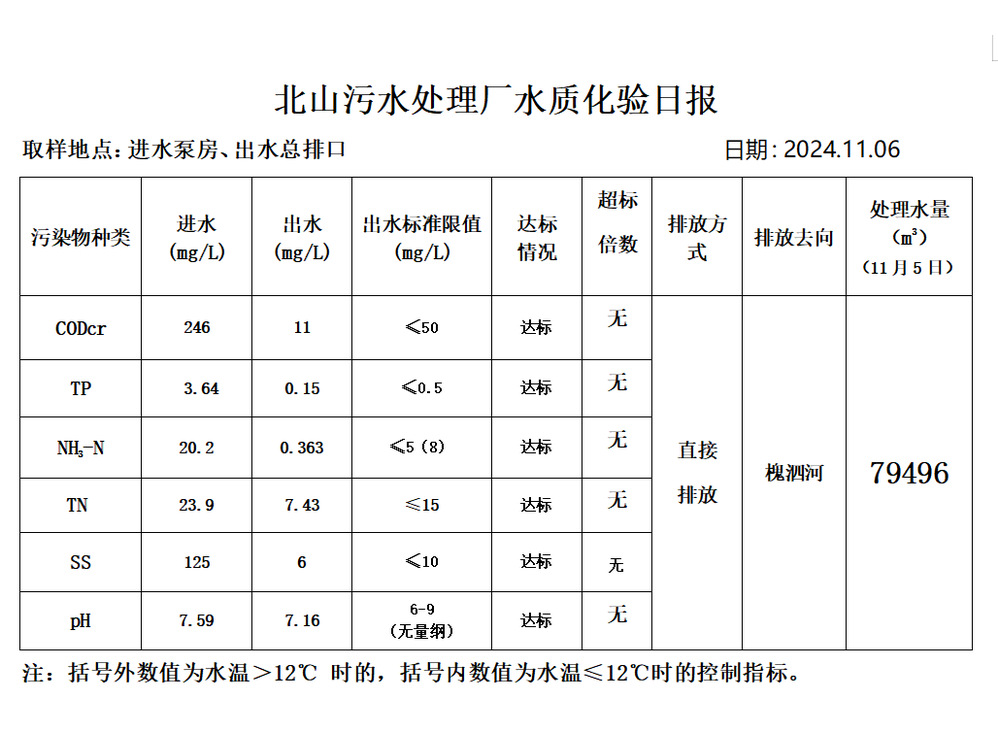 北山污水处理厂水质化验日报(2024.11.6)