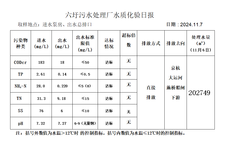 六圩污水处理厂水质化验日报(2024.11.7)