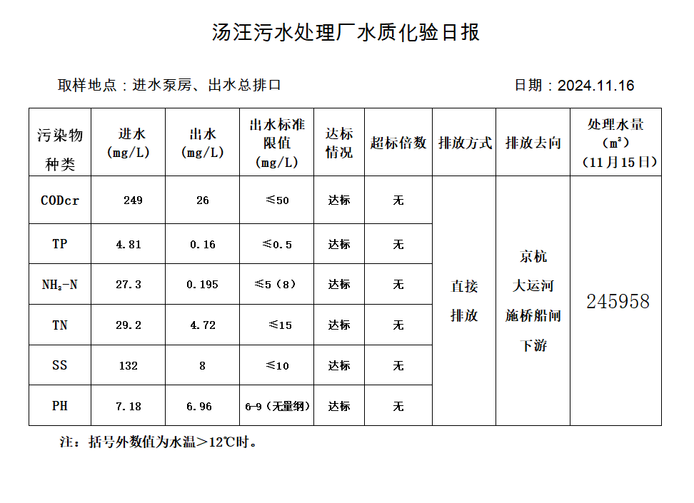 汤汪污水处理厂水质化验日报(2024.11.16)