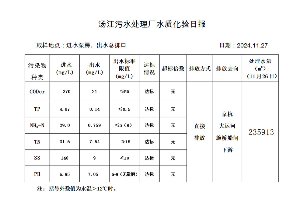 汤汪污水处理厂水质化验日报(2024.11.27)