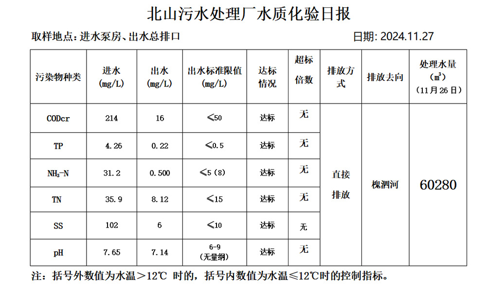北山污水处理厂水质化验日报(2024.11.27)