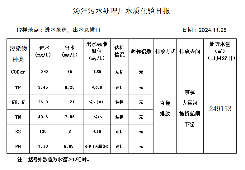 汤汪污水处理厂水质化验日报(2024.11.28)