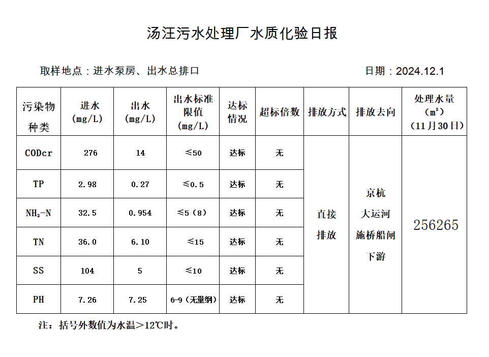 汤汪污水处理厂水质化验日报(2024.12.1)