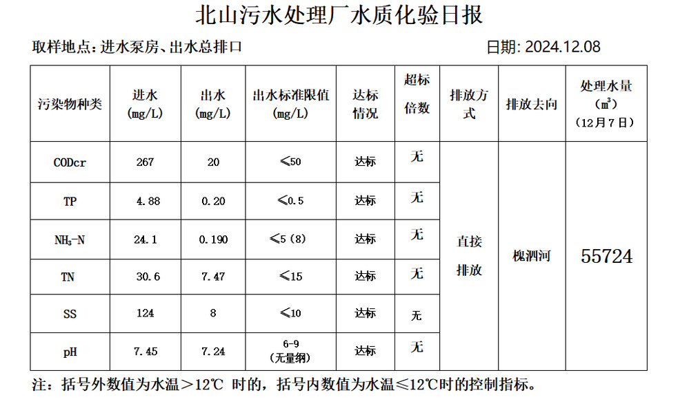 北山污水处理厂水质化验日报(2024.12.8)