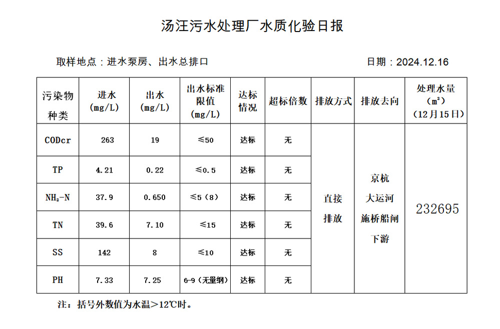 汤汪污水处理厂水质化验日报(2024.12.16)