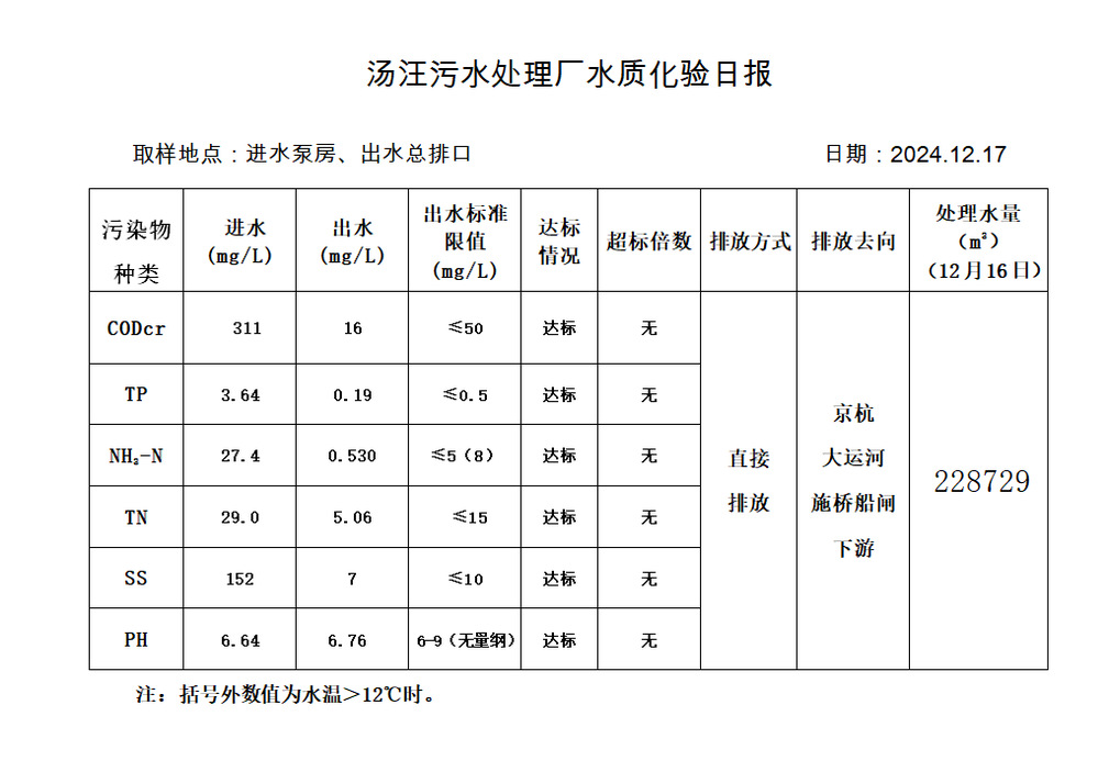 汤汪污水处理厂水质化验日报(2024.12.17)