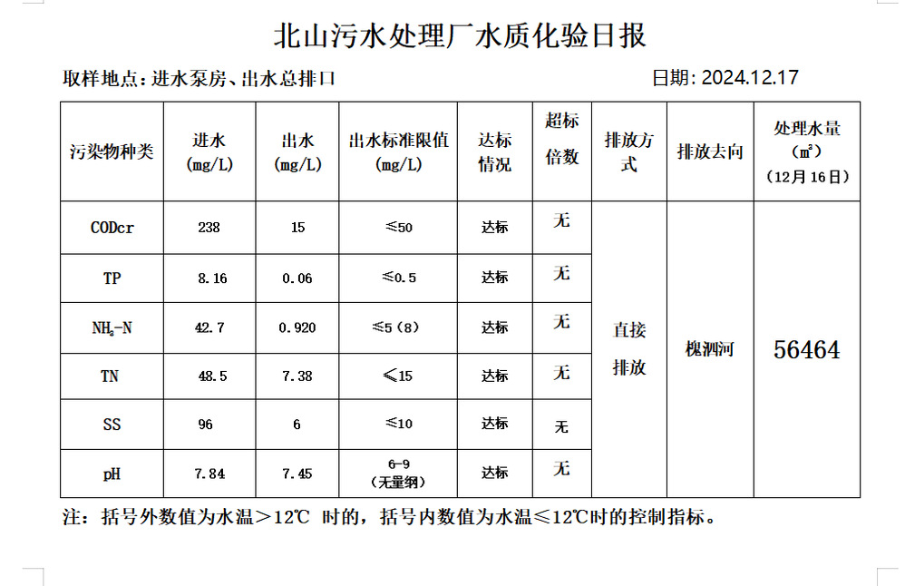 北山污水处理厂水质化验日报(2024.12.17)