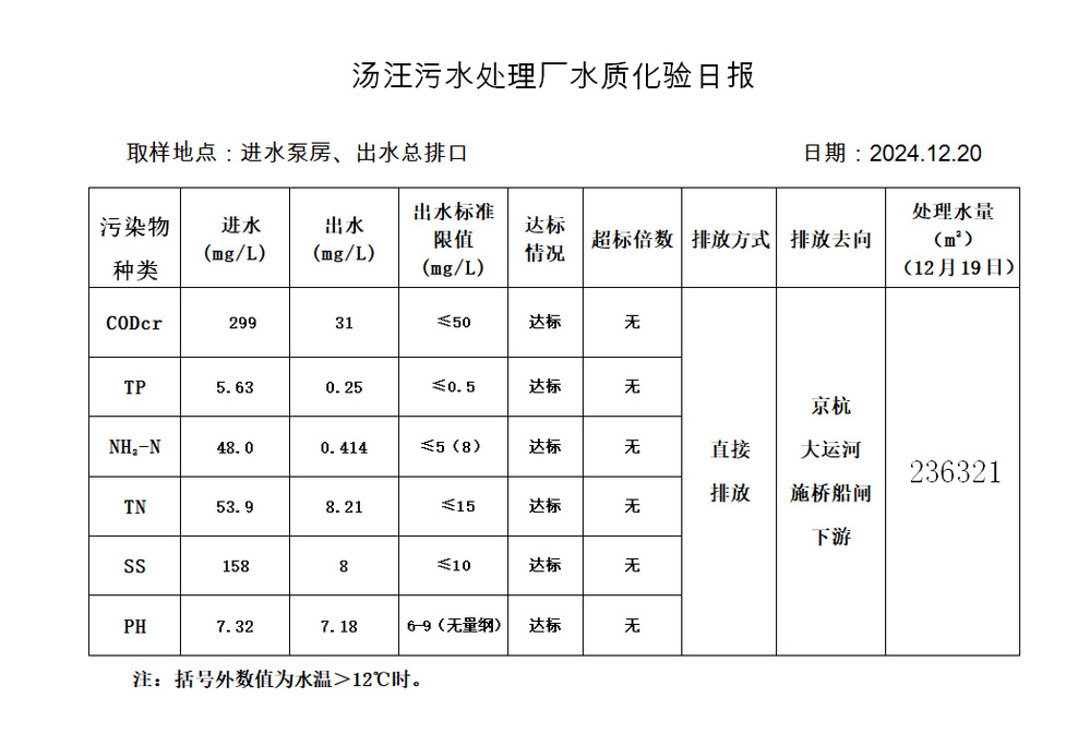 汤汪污水处理厂水质化验日报(2024.12.20)