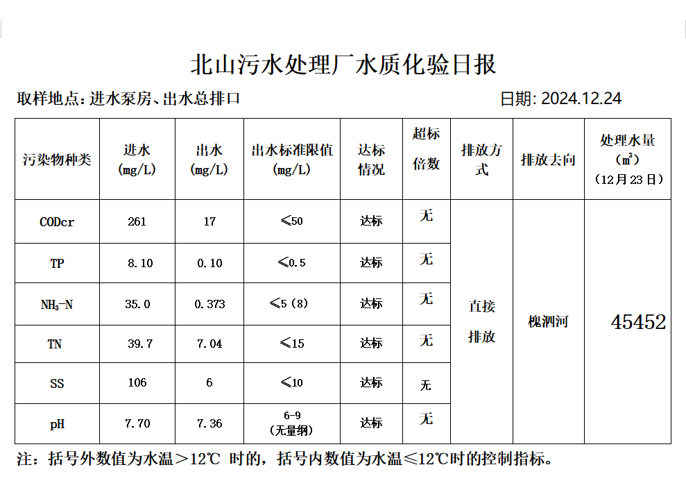 北山污水处理厂水质化验日报(2024.12.24)