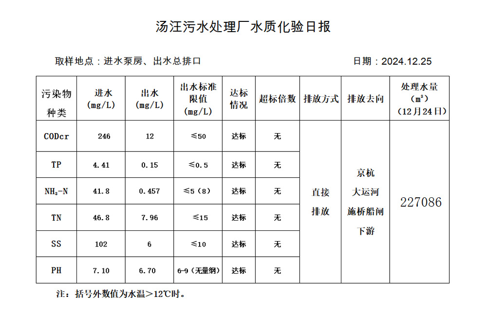 汤汪污水处理厂水质化验日报(2024.12.25)