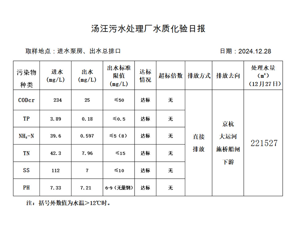 汤汪污水处理厂水质化验日报(2024.12.28)