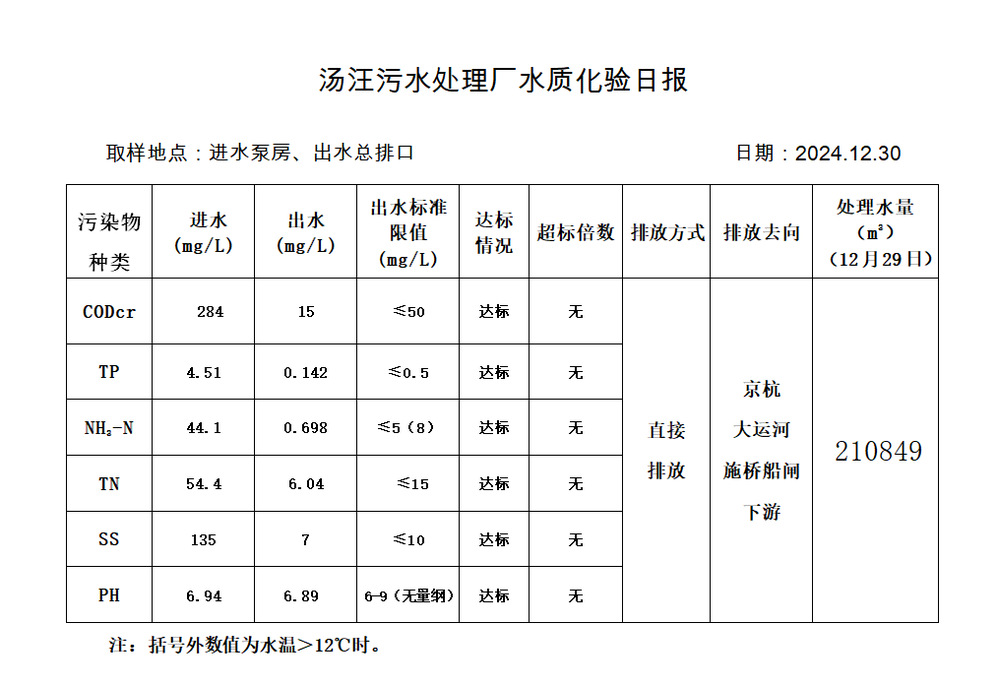 汤汪污水处理厂水质化验日报(2024.12.30)