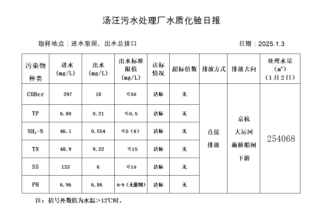 汤汪污水处理厂水质化验日报(2025.1.3)