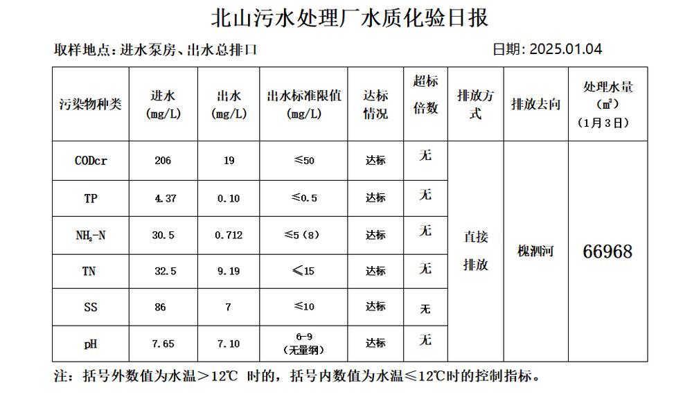 北山污水处理厂水质化验日报(2025.1.4)