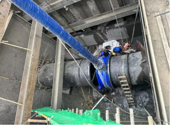 在进行现场安全交底后,施工人员先后完成了井下障碍物清除、气囊封堵、堵头砌筑、钢板堵头密封和上游来水调度等安全保障工作。在安全员现场全程监管下,圆满完成了新旧管道的对接改造任务,为加快推进项目进水调试打下了坚实基础。