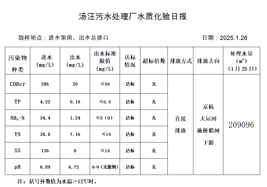汤汪污水处理厂水质化验日报(2025.1.26)