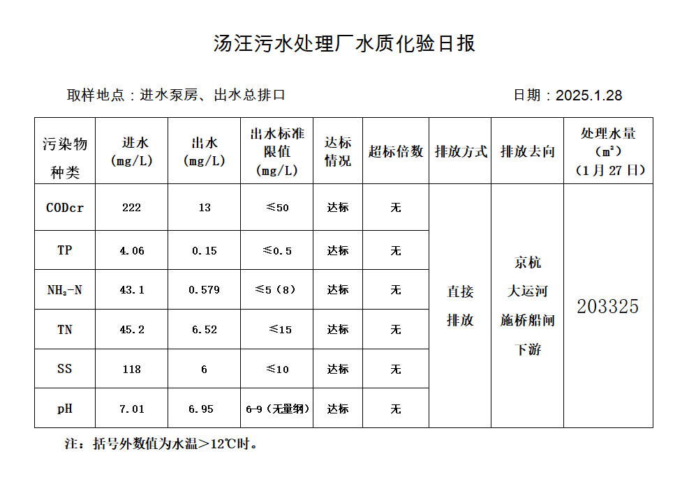 汤汪污水处理厂水质化验日报(2025.1.28)