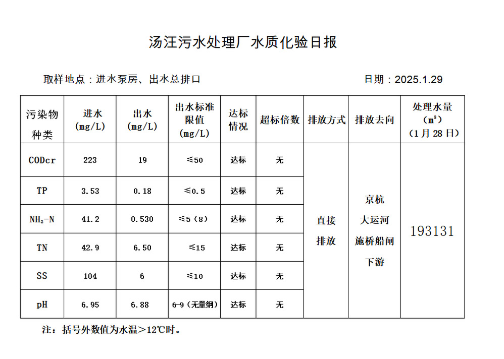 汤汪污水处理厂水质化验日报(2025.1.29)