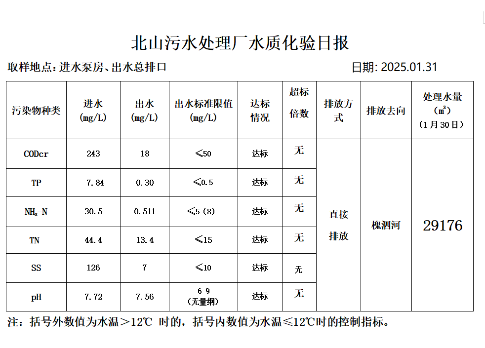 北山污水处理厂水质化验日报(2025.1.31)