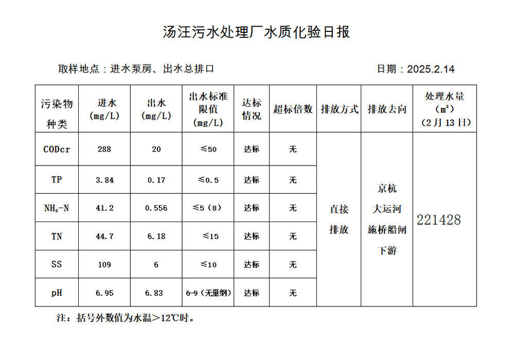 汤汪污水处理厂水质化验日报(2025.2.14)